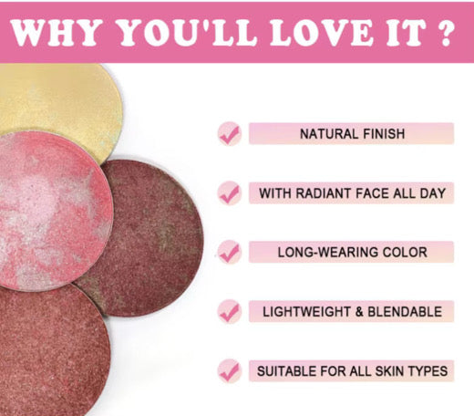 Coral Pink Baked Blush: A lush, highly pigmented glow that you can build from a whisper to a bold statement. The matte base delivers a subtle shimmer, inviting your cheekbones to catch the light. Infused with high-color, brightening pigments and jojoba seed oil, it caresses the skin with long-wearing, smooth coverage—promising a cheeky pop of color that’s irresistible. It flatters every skin tone—from porcelain to deep—leaving a healthy, radiant flush that lingers like a secret you can’t help but show off.